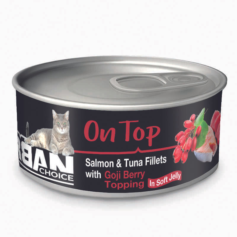 מעדן נתחוני סלמון וטונה בג'לי בתוספת גוג'י ברי, שימורי מזון משלים לחתולים בכל הגילאים. המעדן מכיל רכיבים טבעיים ואיכותיים בלבד ללא צבעי מאכל או חומרים משמרים. *המעדנים הינם מזון משלים, אין להאכיל בהם באופן בלעדי.